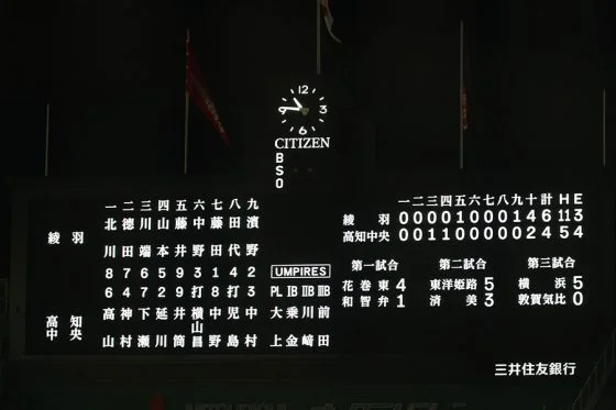 第3試合で横浜 vs 敦賀気比の試合が強い雨で一時中断され、再開に時間を要したため、第4試合の開始も午後7時49分と通常より大きく遅れた。